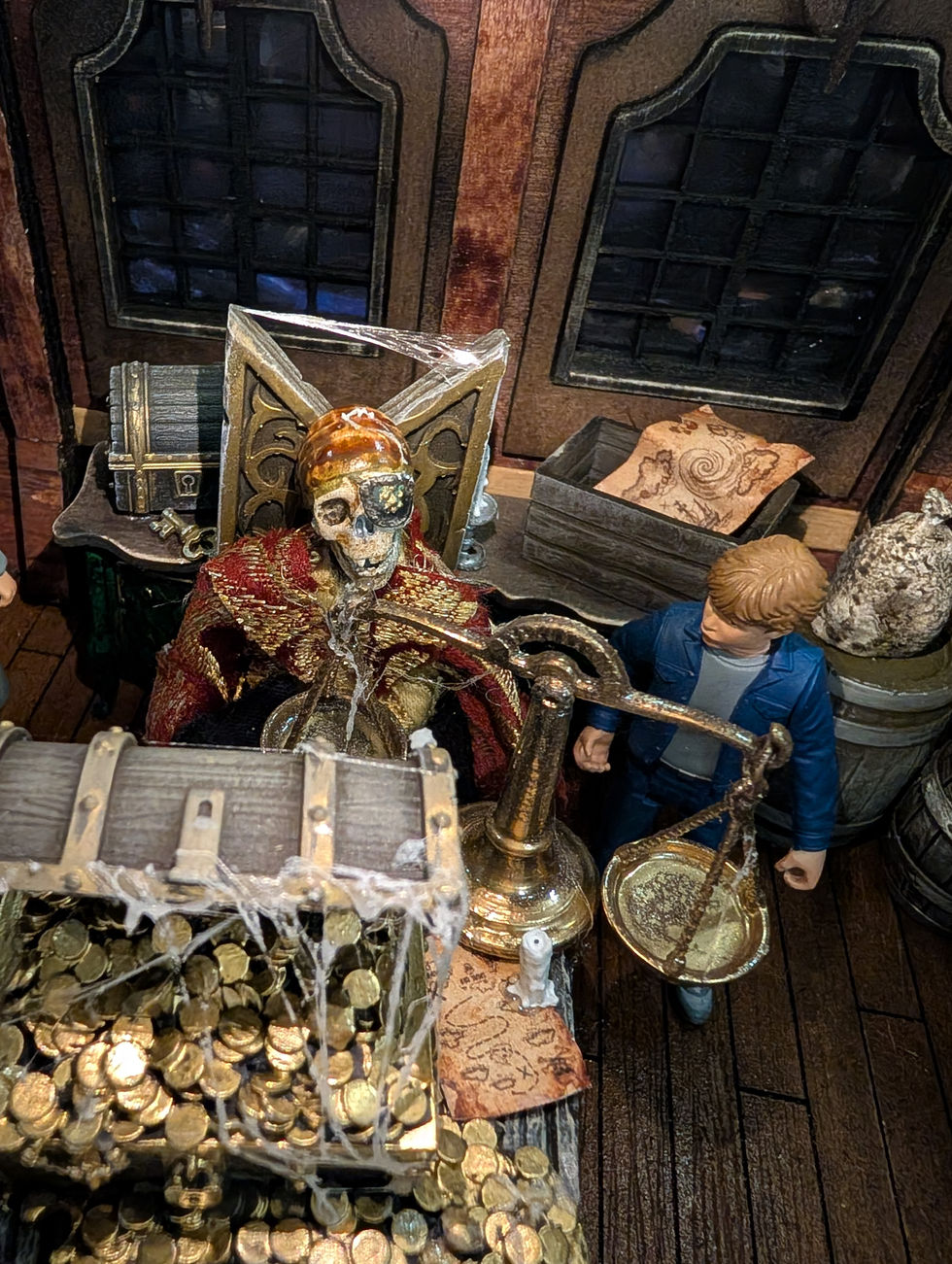La scena rappresenta l’interno della nave di Willy l’Orbo, colta in un momento sospeso, carico di tensione e mistero. L’ambiente è costruito come un fermo immagine cinematografico, dove ogni elemento contribuisce a raccontare una storia.